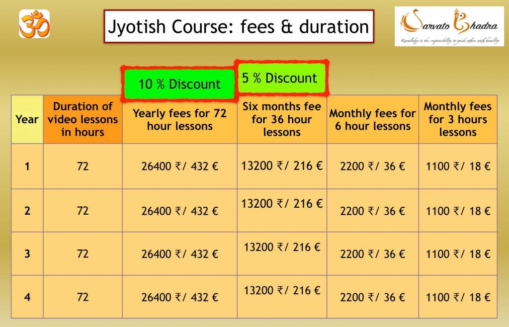3. Jyotish video lessons of 36 hours duration (1/2 year) = 13200 ₹/ 216 € (5 % discount, so you pay 12540 ₹/ 205 €)