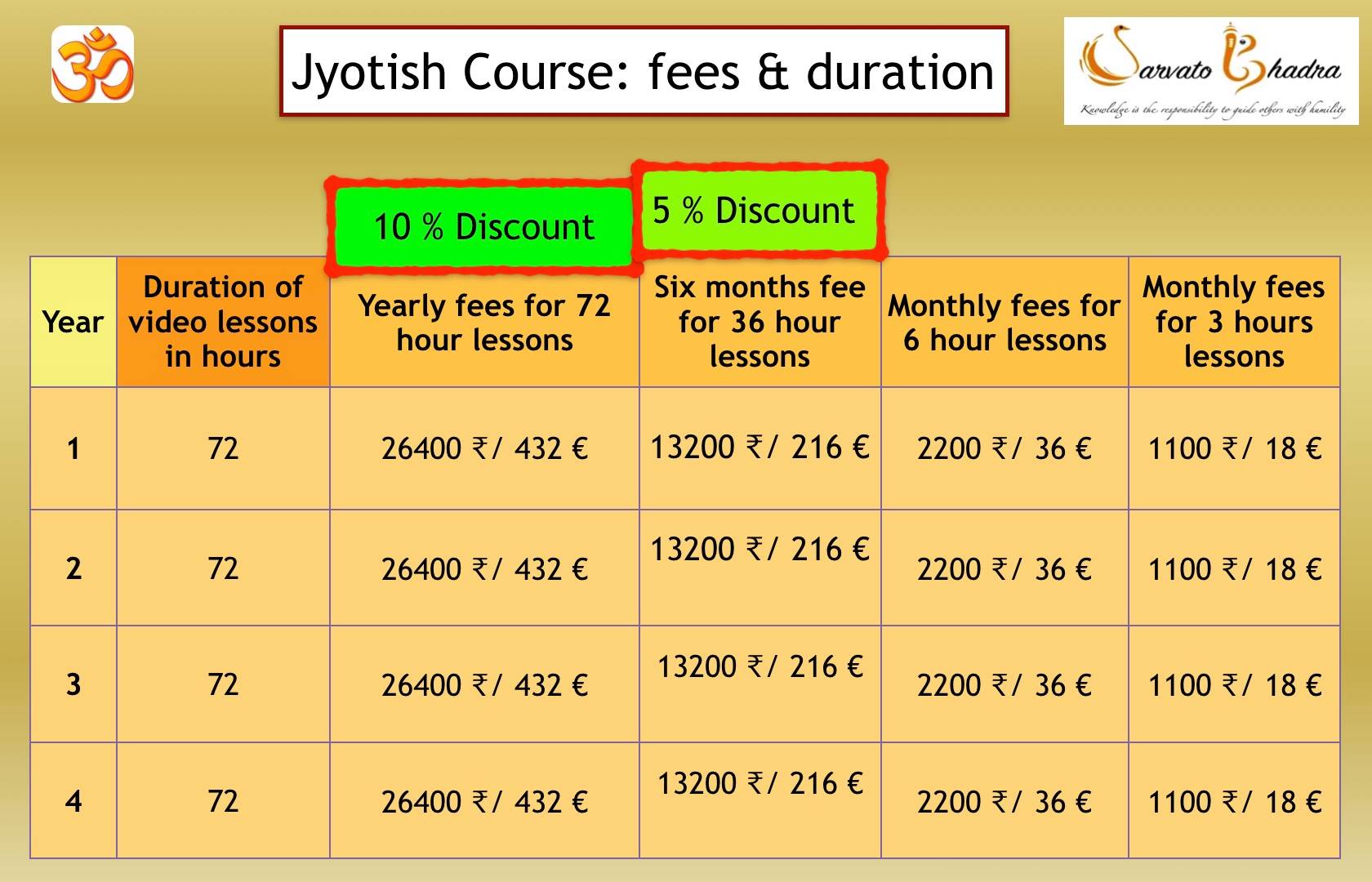 4. Jyotish video lessons of 72 hours duration (1 year) = 26400 ₹/ 432 € (10 % discount, so you pay 23760 ₹/ 389 €)