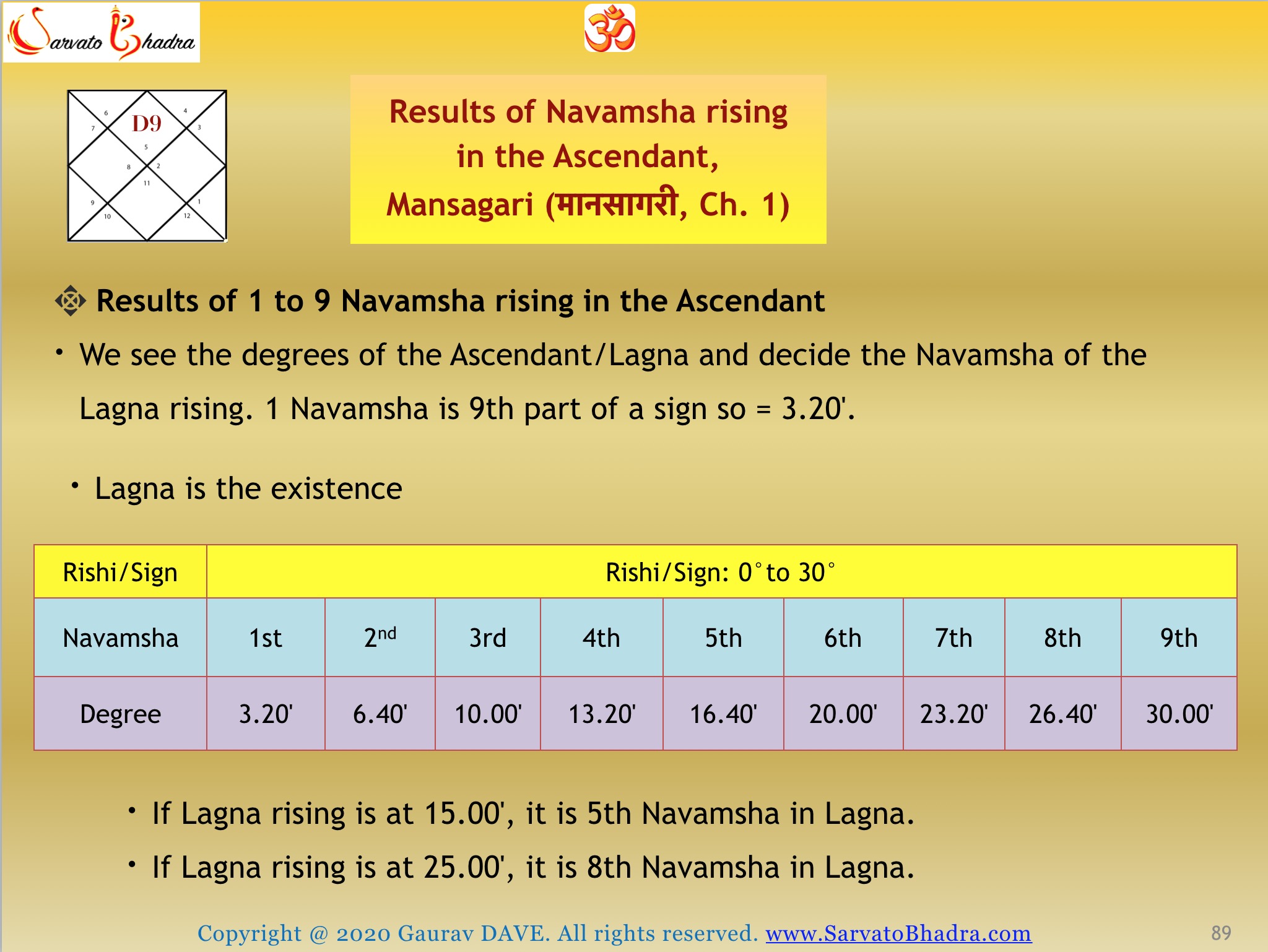 So If the Lagna rising is at 15.00′, it is 5th Navamsa in Lagna. If the Ascendant rising is at 25.00′, it is 8th Navamsa in Lagna.